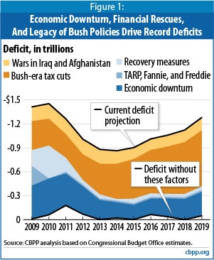 Responsabilidades por el déficit de los EE.UU. De acuerdo a la Conngressional Budget Offcie, la responsabilidad por el actual déficit de los EE.UU. se debe a Bush, y para esto la siguiente figura es concluyente: Gracias a una referenciaen B. Delong