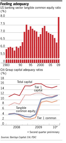Según Lex, para los inversionistas lo importante para ver la solidez de un banco son las reservas de nivel 1 depuradas. Indirectamente, el valor de las acciones a menudo incluye goodwill e intangibles. Se debería eliminar el valor de los intangibles y goodwill, ya que en caso de crisis no valen mucho. Las acciones preferentes se deberían incorporar solo si la deuda asociada no es exigible. En todo caso, los reguladores bancarios todavía no tienen una doctrina clara en este tema, por lo que los inversionistas deben tomar precauciones al evaluar el apalancamiento de un banco. La siguiente figura del Financial Times muestra la evolución del capital bancario del sector bancario y de Citi.