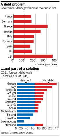 El FT describe una excelente idea de Jacques Delpla y Jakob von Weisäcker. Ellos proponen que una parte de la deuda (la parte segura), tenga prioridad sobre el resto de la deuda. Por ejemplo, toda la nueva deuda emitida por el gobierno norteamericano estaría subordinada a la deuda actual (hacerlo al revés rompería los contratos y sería equivalente a un default). Para la Eurozona, proponen que la deuda segura –o azul– de los países componentes sea hasta el 60% del producto del país (y estaría garantizada por la eurozona completa), y el resto –deuda roja– sería subordinada, como lo muestra la figura.