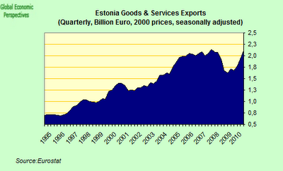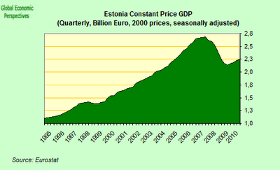 En Estonia, tal vez por ser un país democrático, luego de más de cincuenta años de estar sometidos a la Unión Soviética, estuvieron más dispuestos a aguantar la crisis sin intentar amortiguarla. Parece que está resultando, como los señala A Fistful of Euros, que tiene este gráfico de la producción industrial de Estonia (todos los gráficos son del mismo artículo):