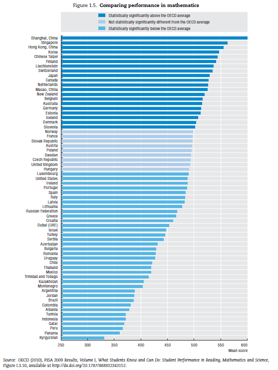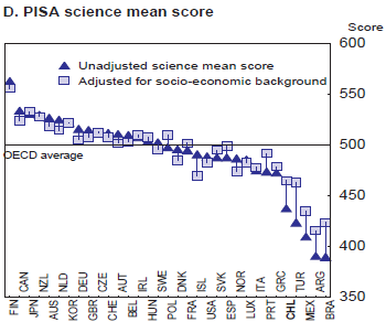 Nota En un documento reciente de la OECD describiendo la educación en Chile, se encuentra la siguiente figura que muestra que le habría pasado a los resultados del Pisa de ciencias si se hubiera corregido por el nivel socioeconómico, ya que muchos niños en Chile (comparados con otros países de la OECD) provienen de hogares desventajados. Incluso así hay diferencias con el promedio de la OECD, aunque se reduce mucho, y el país termina pareciéndose a Grecia. El gráfico corresponde al Pisa de ciencas de 2006, esperemos que haya mejorado desde entonces.