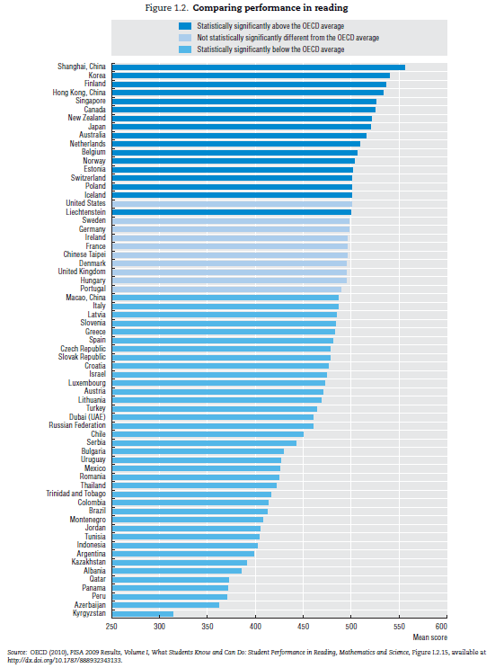Ayer participé en un Panel sobre las universidades públicas en mi Facultad (más sobre esto en otra entrada), y en ella un colega mencionó lo pésima que era la educación chilena y como no había mejorado nada en los últimos veinte o treinta años. Es el tipo de frases que se usan sin pensar, especialmente cuando, como en el caso de mi colega, están ante un público que comparte su visión ideológica. No lo pude dejar pasar. Chile claramente tiene bajos niveles educacionales comparados con los países más ricos de la OECD, pero buenos a nivel latinoamericano y que están mejorando rápidamente. El informe «Pisa 2009 at a Glance«, nos da una radiografía comparativa de la educación chilena y de como ha cambiado en el tiempo (la prueba PISA es probablemente la que mejor compara los estándares educacionales entre países). En el 2009, en lectura, los promedios por países son los que aparecen en el gráfico (estamos mucho mejor que México y Uruguay, que nos siguen en América Latina):