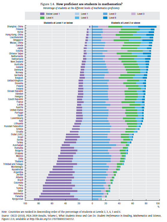 En matemáticas nos va un poco peor que a México y Uruguay (algo que debería darnos vergüenza). Hay que notar que aunque tenemos menos niños por debajo del nivel 1 (nivel 1 es el más bajo nivel de competencia) en matemáticas que esos países, en los niveles más avanzados nos va más mal.