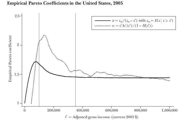 DS consideran un gobierno que valora la redistribución del ingreso (al menos un poco). Esto se deduce directamente de una función de bienestar social utilitaria, cuando la utilidad marginal del consumo tiende a cero a medida que el consumo aumenta –el supuesto usual–. El ejemplo clásico es cuando la utilidad del consumo es logarítmica. A partir de este supuesto derivan la tasa máxima de impuestos. Para eso, muestran primero que la distribución de los ingresos en el tope de los ingresos es Pareto. Las conclusiones son musy distitnas de las que se obtienen con una distribución lognormal de los ingresos, que es lo que usan Mankiw et al, y los argumentos de DS para criticar el supuesto lognormal son convincentes. El ajuste de la Pareto se muestra en la siguiente figura, proveniente del artículo de DS. La segunda línea vertical muestra el ingreso de corte para el percentil 99. La línea punteada muestra el valor del parámetro empírico a de la Pareto, y se observa que se compara bien con el parámetro a de la Pareto teórica, para ingresos de más de US$400.000 y un valor a=1.5.