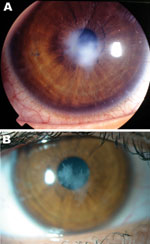 El ojo de la adolescente antes y después del tratamiento. El enrojecimiento se debe a la keratitis inducida por la ameba. Foto de Cohen G, Hoffart L, La Scola B, Raoult D, Drancourt M. Ameba-associated keratitis, France [letter]. Emerg Infect Dis [serial on the Internet]. 2011 Jul [date cited]. http://dx.doi.org/10.3201/eid1707.100826En la ameba habían cuatro organismos. El primero es una nueva especie de endobacteria. La segunda es un bacilo similar a una especie conocida deendobacilo de las amebas. La ameba contenía asimismo un virus gigante (estos virus pueden llegar a ser mayores que algunas bacterias) . Por último, la ameba contenía fagovirus, es decir virus que son parásitos de otros virus, en este caso, del virus gigante.
