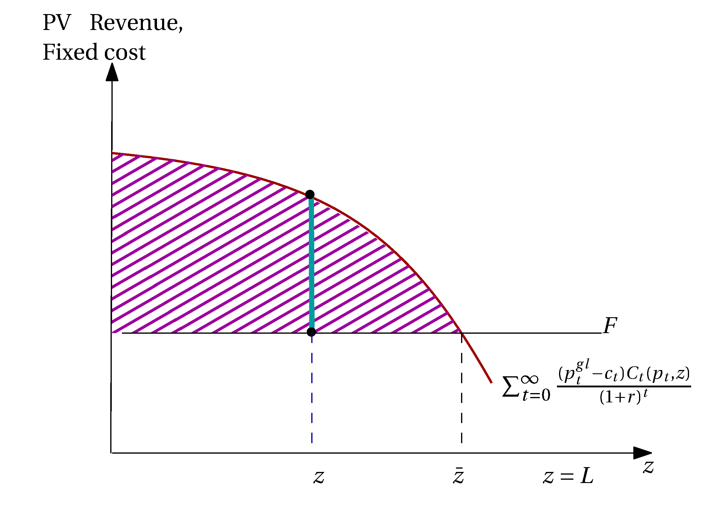 Estas inversiones ya no son propiedad de la empresa regulada, pero destinó recursos a a ellas.3 Mientras las empresa no está regulada y no cobra cargos fijos, la empresa de gas está dispuesta a invertir recursos en atraer a un cliente $ latex z$ a la izquierda de , hasta el monto de la diferencia entre la curva y . Esto se muestra como el tramo vertical grueso en la figura siguiente: