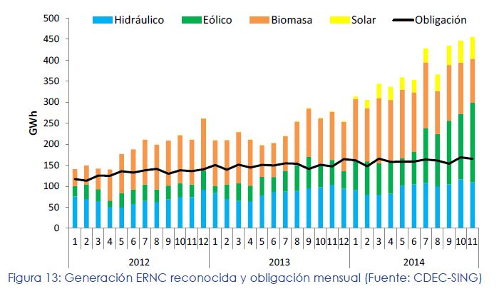 La obligación legal es la línea negra, y es esa la que gatilla un subsidio implícito, pues las generadoras deben pagar USD30 por MWh de energía por debajo de ese límite. Claramente el límite se ha sobrepasado con creces, y la entrada de ERNC se debe en gran parte a que son rentables sin subsidios.
