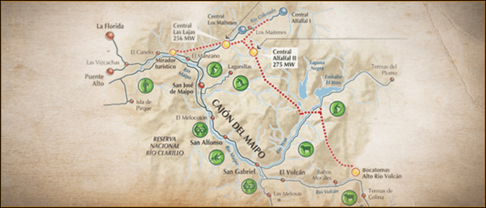El proyecto consta de dos centrales de pasada en serie, Alfalfal II y Las Lajas, en el sector alto de Río Maipo, con una potencia de 531MW. Toma aguas de varios ríos: Volcán, Yeso, de las aguas de salida de la central Alfalfal y del Río Colorado.