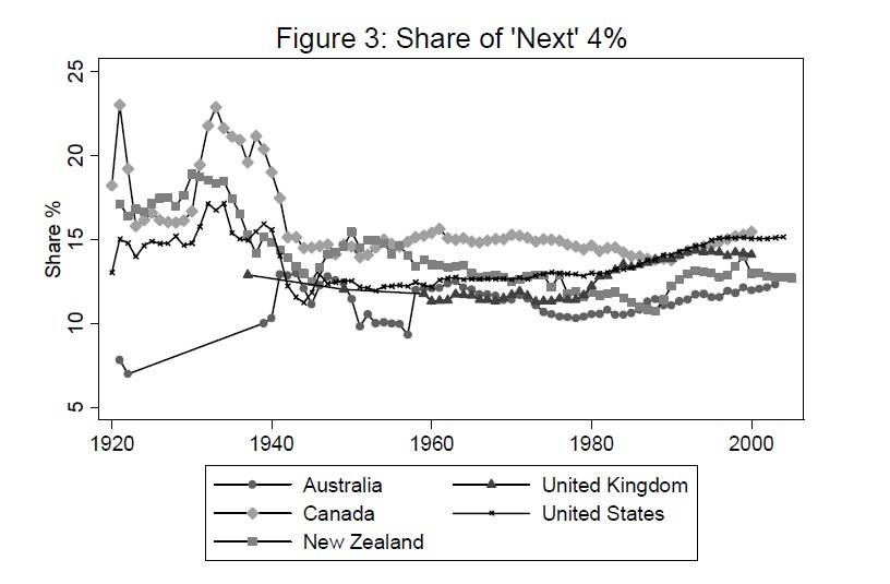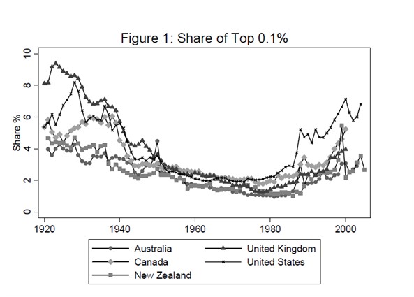 La distribución del ingreso en los países anglosajones muestra un aumento en la desigualdad desde los años 1970 (espectacular para los EE.UU.), con la mayor parte de los beneficios yendo hacia el 0.1% o más arriba en la distribución de ingresos. En The Distribution of Top Incomes in Five Anglo-Saxon Countries over the Twentieth Century, Atkinson y Leigh estudian esta evoliución desde los años 20. La siguiente figura muestra lo que ha pasado en el período a los ingresos de los más ricos: