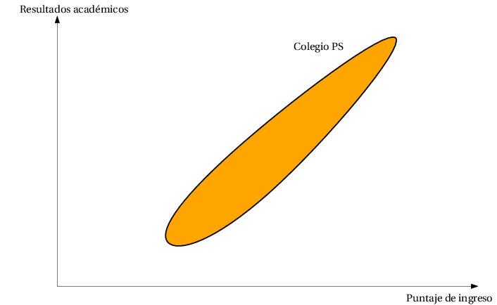 El problema de la PSU es que el entrenamiento tiene mucho más importancia en el rendimiento que en el caso de pruebas que miden habilidades, como la antigua PAA. Por lo tanto, es posible que un estudiante de habilidades medianas pase por un alumno de talento si recibe suficiente entrenamiento (el que depende en general de sus condiciones socioeconómicas y de su colegio o liceo de origen). Supongamos que al interior de un colegio (un particular subvencionado, por ejemplo) la relación entre rendimiento potencial en Plan Común de Ingeniería   y puntaje de ingreso viene dado por la nube de la figura siguiente. Por lo tanto, al interior de cada colegio, el puntaje de ingreso con PSU ordena a los estudiantes en base a sus habilidades para Plan Común.