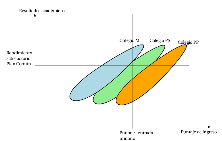 Una alternativa para resolver ese problema sería establecer cuotas por origen de los alumnos, pero ese es un mecanismo muy arbitrario, y que tiende a favorecer a los estudiantes de algunos liceos por sobre otros. El mundo real no es tan simple como el de la figura, pues no sabemos dónde está ubicado cada colegio y si la relación entre puntaje y rendimiento es la misma para distintos colegios. Pero al menos permite explicar la poca capacidad predictiva de la PSU y también sugiere que deberíamos cambiarla por una prueba que le de más peso a las características intrínsecas de los estudiantes.